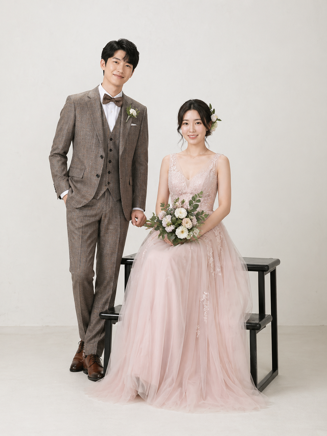 人気の定番プラン。衣装2着・背景2パターンで、ふたりのさまざまな表情をたっぷり記録します。データ60枚納品。